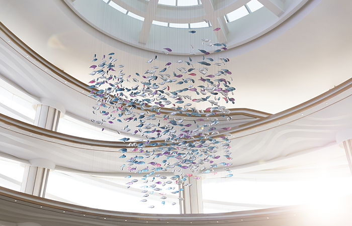 To integrate the sculpture with the lobby, the kinetic school of fish is located between the static coral reef at its base and the skylight. Nearly invisible steel cables support the individual elements and are powered by a mechanism ingeniously hidden in the coral reef.