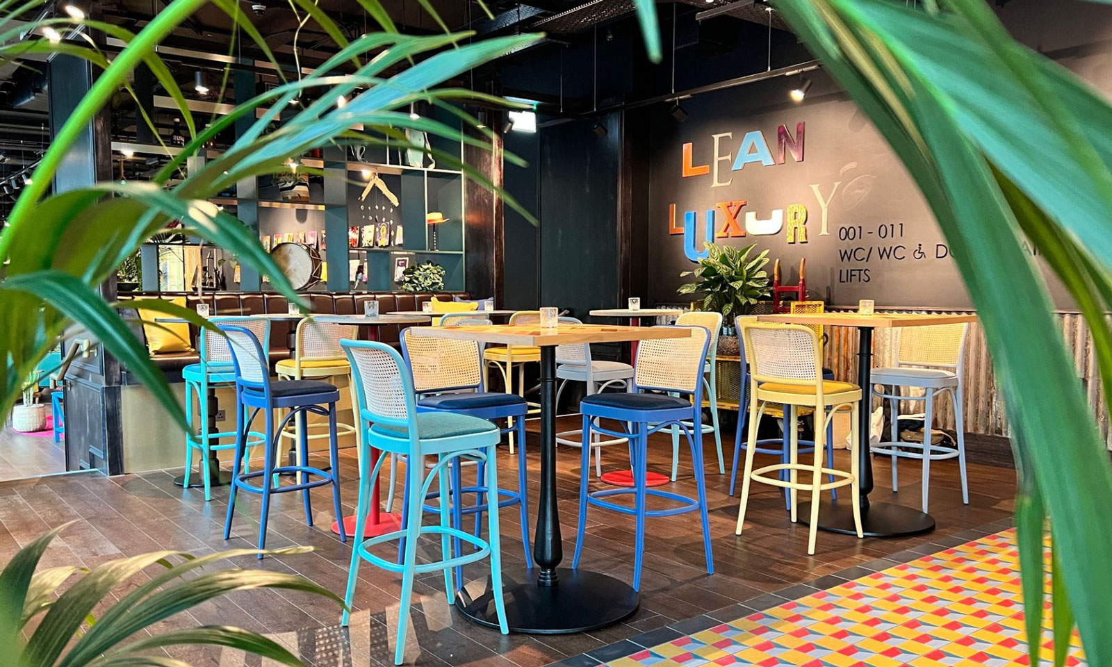 Contemporary and colourful, the Agatha stool with simple metal frame is upholstered in a range of different colours. The venue has windows facing the street with colourful wall art outside. At first glance, the wall art outside looks like a picture chosen to match the interior design.