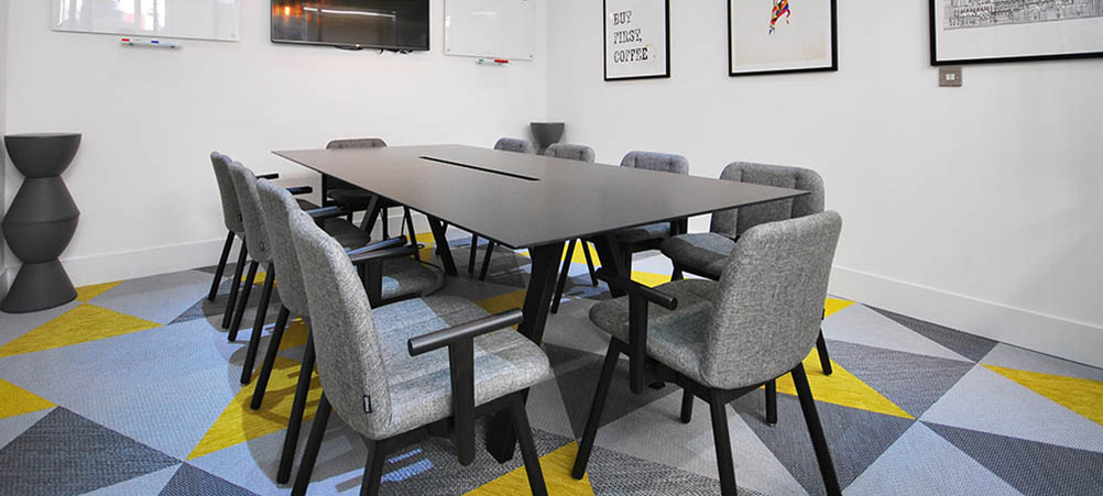 Upon entering Headspace Marylebone, statement wing back chairs in soft grey wool make up the reception and waiting areas. The contemporary interiors include a purple and yellow colour palette which is introduced in upholstered lounge chairs and playful yellow geometric patterned floors. Taking centre stage, each meeting room is given a luxurious modern take with stylish armchairs and designer Kartell stools creating a clever contrast to today’s mundane corporate boardrooms.