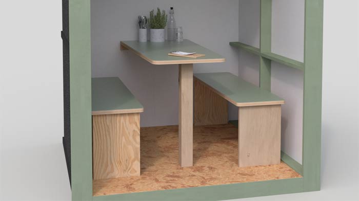 The pods are made from FSC wood which can be left natural or painted in a choice of colours. The seating and table inside have a laminate coating which not only makes for easy cleaning, but also lends the possibility of multiple colours.