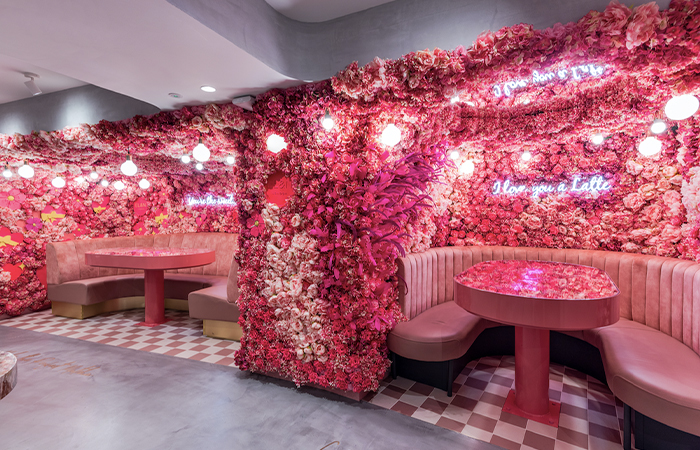 No blooms have been spared in the blushing interiors of EL&N, with flowers in every cascading down the walls and encasing the hanging lighting. Neon shapes and typography peek out from between buds and mirrors help to create pretty illusions.
