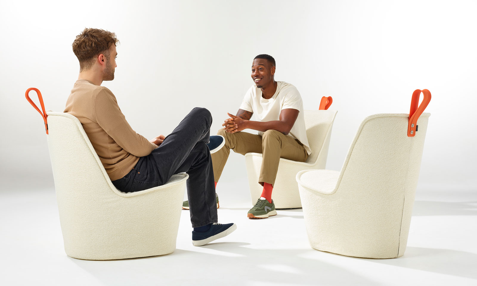 Compact yet solid and stable, Pippin provides upholstered comfort and support that invites longer interactions. At the same time, it readily moves as and where it needs to: it’s set on wheels and it comes with a convenient strap handle that facilitates movement while adding a playful touch.