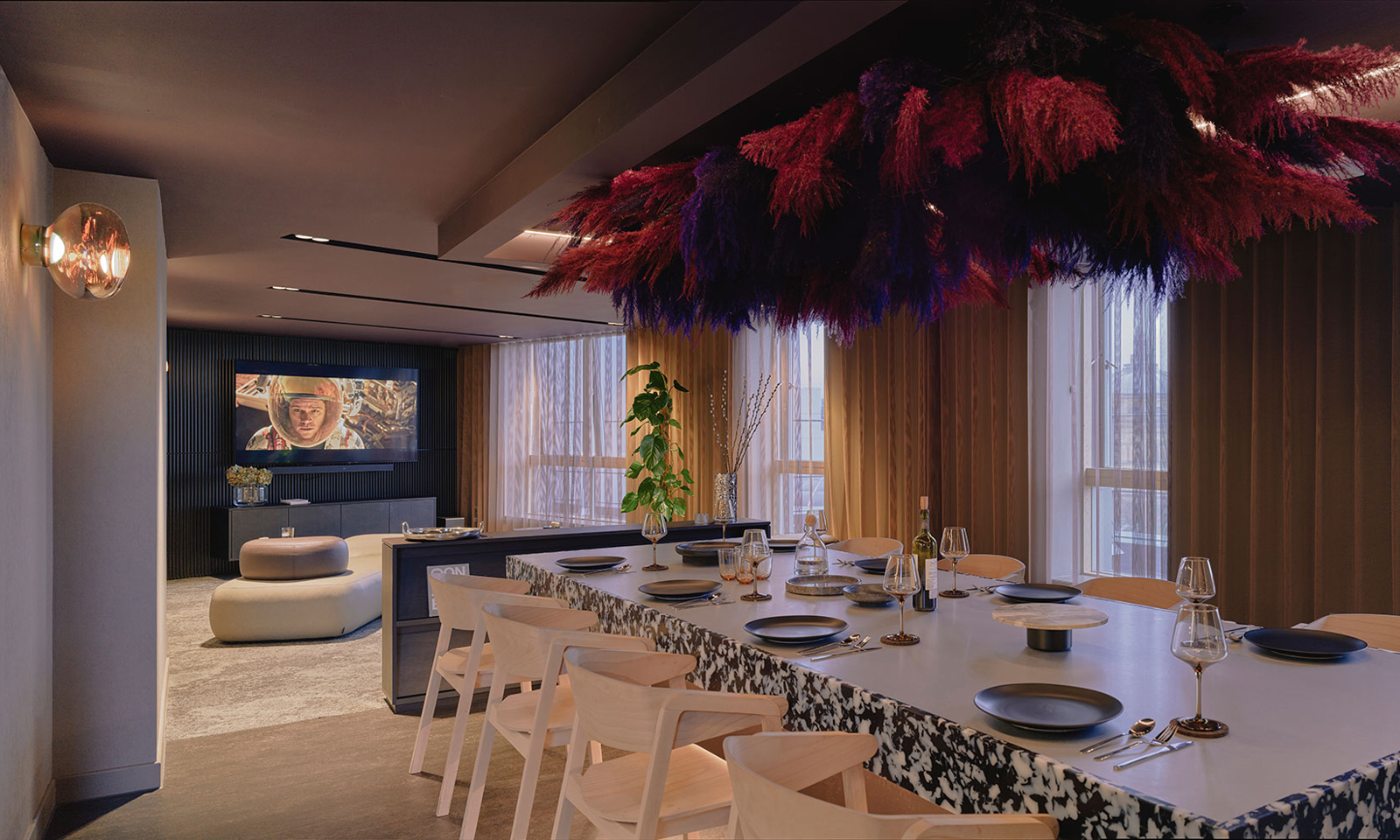 ‘Textures are also a huge part of the materiality of the scheme, and play a significant role in its elevation towards a more premium ambience. Stand-out features include the distressed-metal panels to the rear of the reception desk, as well as the reception desks panelling, finished in Smile Plastics, which features again to the perimeter of the bespoke sixth-floor dining table.’