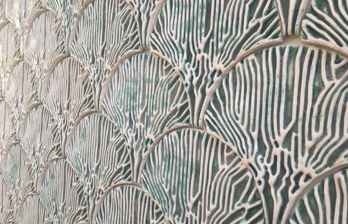 Tel-Aviv based designer Daniel Elkayam shares a similar interest in algae, although a recent collaboration with Polish interior design brand OVO Design has moved his inventive bio-based sheet material called SEAmpathy towards the interiors market. Using Biophilic Design principles, Daniel has created organically shaped timber cut-outs with which frame his speckled algae derived material, turning them into decorative wall panels that sit somewhere between art and design. In contrast, a team of professors who form part of the Bio-ID lab at Bartlett School of Architecture have utilised algae for a very different but pertinent purpose. In discovering that up to 80% of India’s groundwater is polluted as a result of the country’s prolific textile and jewellery industries, the group recognised that a bioreactor that can clean water through bioremediation was required. Cue algae, which they have included in a hydrogel placed in the veined channels of the Indus Tile. Inspired by the veins of a leaf, contaminated water runs down the surface of the tiles and through the channels, where the algae works it’s magic in sequestering pollutants like the heavy metal cadmium from the water, which now clean, is collected and redistributed.