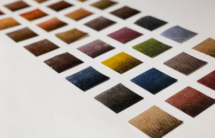 The seafood industry creates more than just waste shells. Fish, notably Salmon, are still a popular dish on many a menu and Designer Andrea Liu looks to transform salmon skin, a by-product of the smoking process, into an alternative to leather. In the process of cleaning, tanning, dyeing and weaving the discarded skins she elevates their value from both an economical and functional perspective. Having initially been inspired by Alaskan Native American methods the patterns of the weave are also reminiscent of those you’d find on traditional fisherman’s jumpers or ganseys, linking the visual narrative back to the origins of the materials themselves.