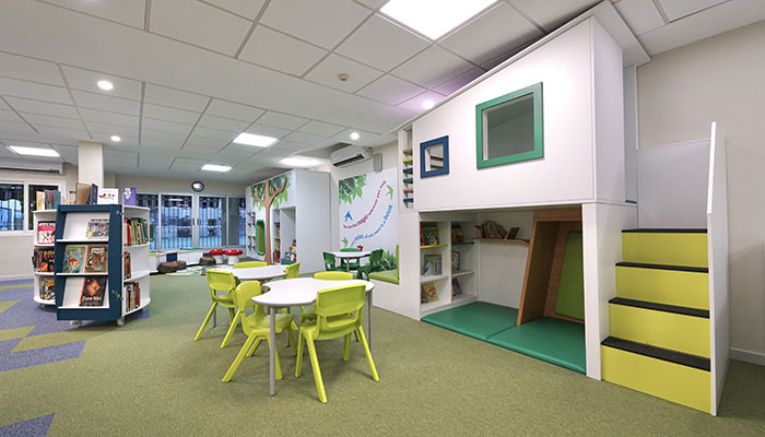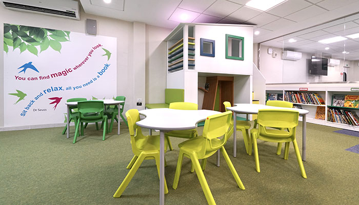 The library caters for over 300 pupils in three different age groups (3-6 years, 7-11 years, and teens), so each area had to have its own character. For the younger years, the space needed to be bright and inviting, while offering an area for quiet and group reading. The teenage area needed to include desks for studying as well as soft and comfortable furniture for more relaxed reading.