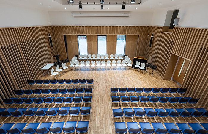 Situated immediately adjacent to the River Brue, the new building has been designed to be sympathetic to the surrounding 17th Century buildings and stone walls, with its two-storey entrance tower and stone-paved courtyard. Inside, there are performance, recital, teaching and recording spaces.