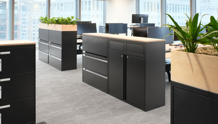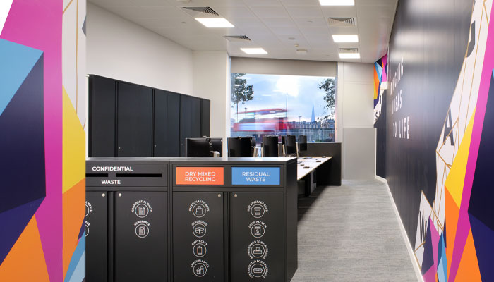 KI’s UK-manufactured 800 Series steel storage lockers, cupboards, waste units and drawer units have been finished in an anthracite grey. This finish was also used throughout open plan areas for the understructures of KI Work2.1 Sit-Stand desks, also manufactured in the UK. Some selected areas of the office feature ‘pebble’-shaped worktops on KI’s Work2.1 Sit-Stand workstations. Custom-designed by tp bennett, they feature white understructures, fabric screens and a stone-like laminate worktop finish. To achieve this unique variation of the standard KI product, tp bennett worked with KI to create and evaluate several mock-ups using different shapes and finishes. This nod to biophilic design is enhanced by the thousands of live plants throughout, and artificial plants in areas where real plants may struggle to survive.
