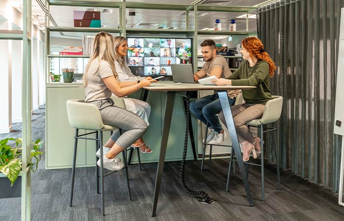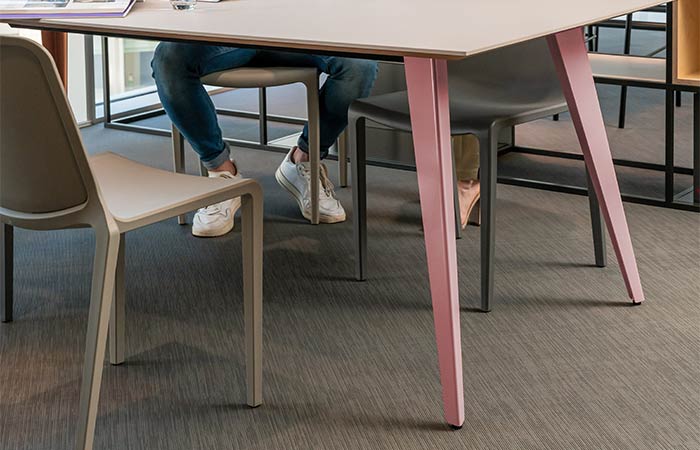 Engineered for simplicity, Zig streamlined under-structure creates is a lighter aesthetic and clearer leg space. The optional central cable management system can support desktop power and accessories if required, whilst poseur height tables can have optional footrails for added user comfort. Chamfered MFMDF worktops mirror the angled, slender silhouette of the legs whilst providing added strength and stability. Both worktops and legs can be specified in a variety of finishes to suit any scheme.