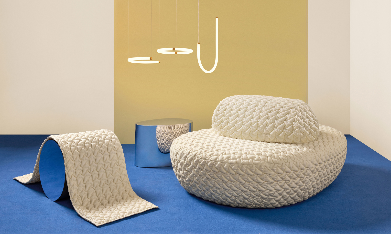 Inspired by Origami, the Japanese art of paper folding, AREA was created after exploring designs that can shrink and expand which is typical of a 4D object. Quilted for a super texture, the fabric is created using 100% recycled wool from fashion with recycled polyester FR foam wadding made from plastic bottles.