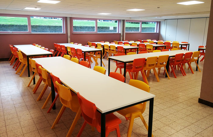 Postura+ chairs were specified in a combination of size 4 (Lime Zest and Parrot Green), and size 6 (Lime Zest, Sun Yellow, Tangerine Fizz and Aqua Blue). The chairs can be quickly and easily stacked and stored away when not required. The tables were adapted to provide two heights with extending feet, allowing them to be extruded and used at a standard height for community events.