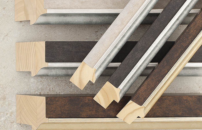The soft brush technique will help avoid any quality issues in transit. Also, all foils have a degradé patina from outside to the inside. Being darker in the outside, together with the metal lip, brings the eye to the centre and to the artwork – ideal for showcasing hero pieces. Chevron sets and a chop service apply to these two new collections, like all Larson-Juhl wooden mouldings.