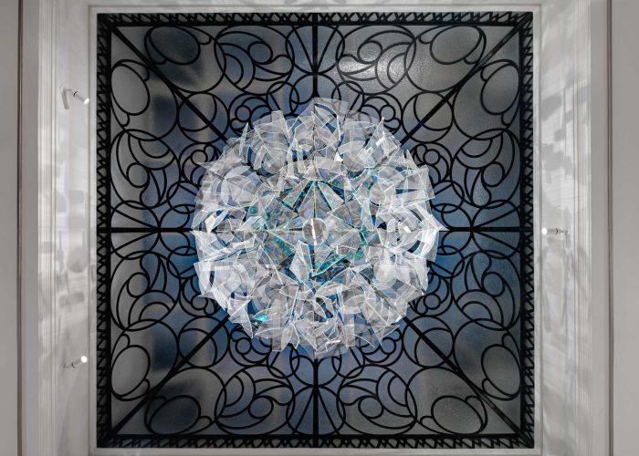 The overall piece looks fragile, but in fact weighs almost a ton. The piece, with an overall height of over two meters and a diameter of 1,69 meters, had to be fixed to the skylight. To hang pieces weighing 920 kilograms into the glass ceiling with a limited pattern of fixation points, LASVIT had to customize the distribution of shards. When you stand right under the installation and look above, each piece is precisely lined up with the pattern on the glass ceiling.
