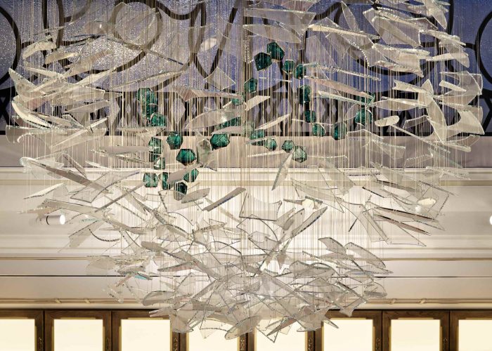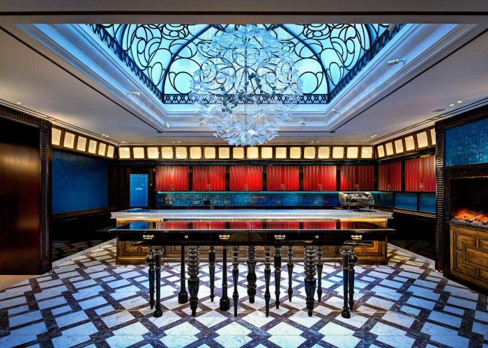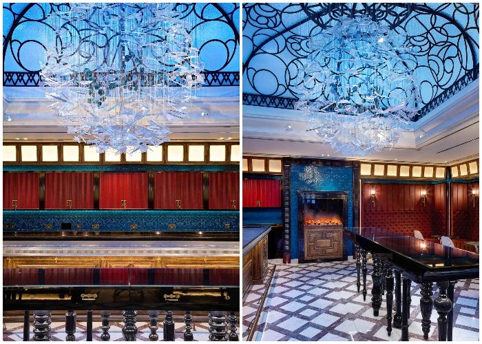 “The bar and lounge, Forty Elephants, is a nod to the 19th and 20th century all-female London crime syndicate who specialised in shoplifting. A notable element in Forty Elephants is the stunning glass art installation. It’s created through a series of broken glass signifying the female gangsters broke into the bar… Buried in the centre of the installation is a jewel toned necklace,” says HBA partner David T’Kint.