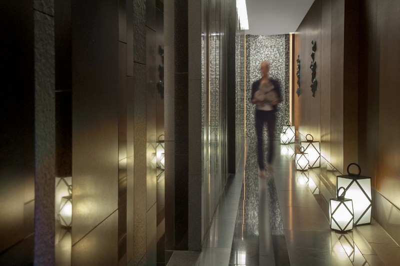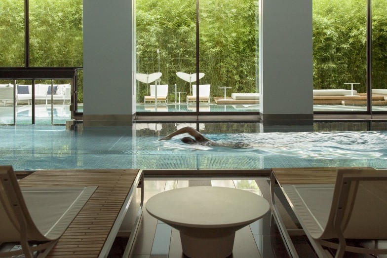 Housed in the lower ground level of the new wing and opening up to an outdoor sunken terrace and garden, Le Spa du Royal provides an urban wellness oasis that is unique in Lausanne and is open to both local people and hotel guests. The 1500m2 is a resolutely modern feature of the hotel, with dark and silvery toned finishes including Nero Assoluto marble flooring, iroko and oak timber and mosaic tiles, softened by copious shear curtaining.