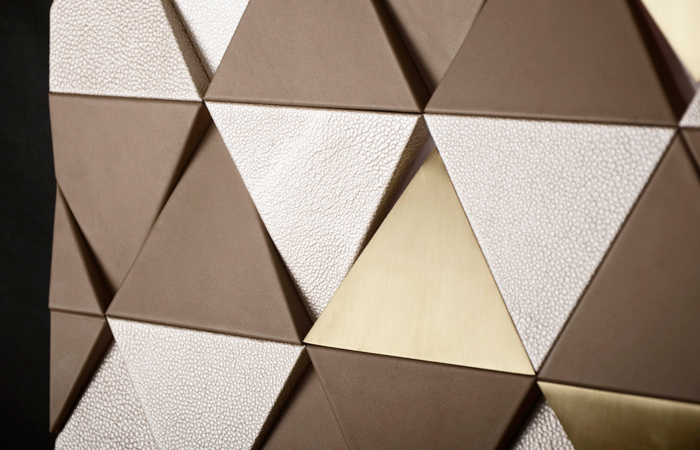 Over in India Parminder Pal Singh has been working for over 20 years in what can be called the luxury end of the interiors market. Using this experience and the knowledge that comes with it he set-up interior surface brand Pintark in 2013, with a UK launch following in 2016. Much like Bill Amberg, the studio prides itself on creating highly crafted and beautifully designed surface panels, most notably in leather. Once again, experienced craft is at the heart of the studio’s manufacturing, with skilled makers carrying out much of the work by hand, be it cutting, stitching or weaving. Often created in a modular format, the leather tiles can be delightfully contrasted with other materials such as brass and timber whilst embossing takes advantage of the pliable nature of leather in creating indented pattern and rich texture.