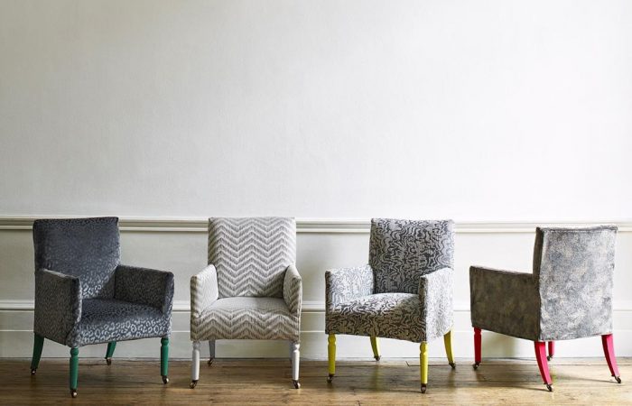 Chairs covered (left to right): Neptune, animal style print on velvet; Astraea, characterful zig-zag weave; Argo, abstract weave and Orion, a foil printed velvet with a contemporary abstract pattern.