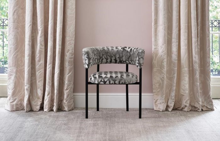 Designed for curtains, Selene’s swirly abstract pattern with an elegant relief is woven with silk and cotton. The chair is covered in Kari – an abstract branch design that’s created by brushing and fixing the velvet pile.
