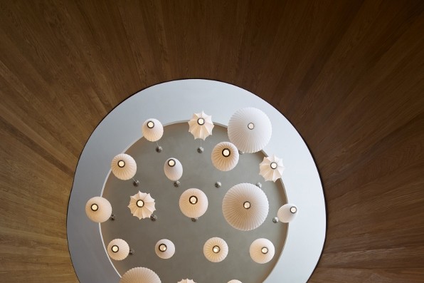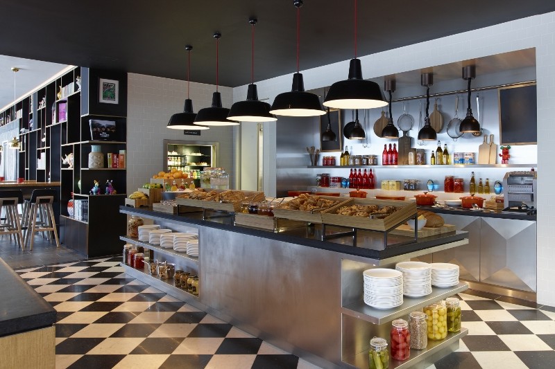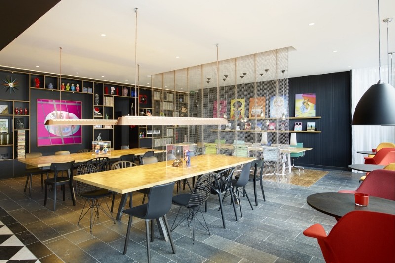 Arriving on the first floor guests have a clear view of the entire space, including the typical citizenM cabinet that runs along the lobby and guides them to the check-in, a lounge bookcase bench, collectionM, the bar and canteenM with large communal tables.
