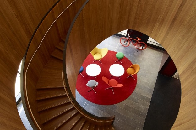 The entrance at ground floor level is marked and covered by the overhanging first-floor lobby. A colourful mural by AVAF that runs all the way up to the first floor, combined with the iconic spiral staircase, invites people to enter the building and visit the hotel.