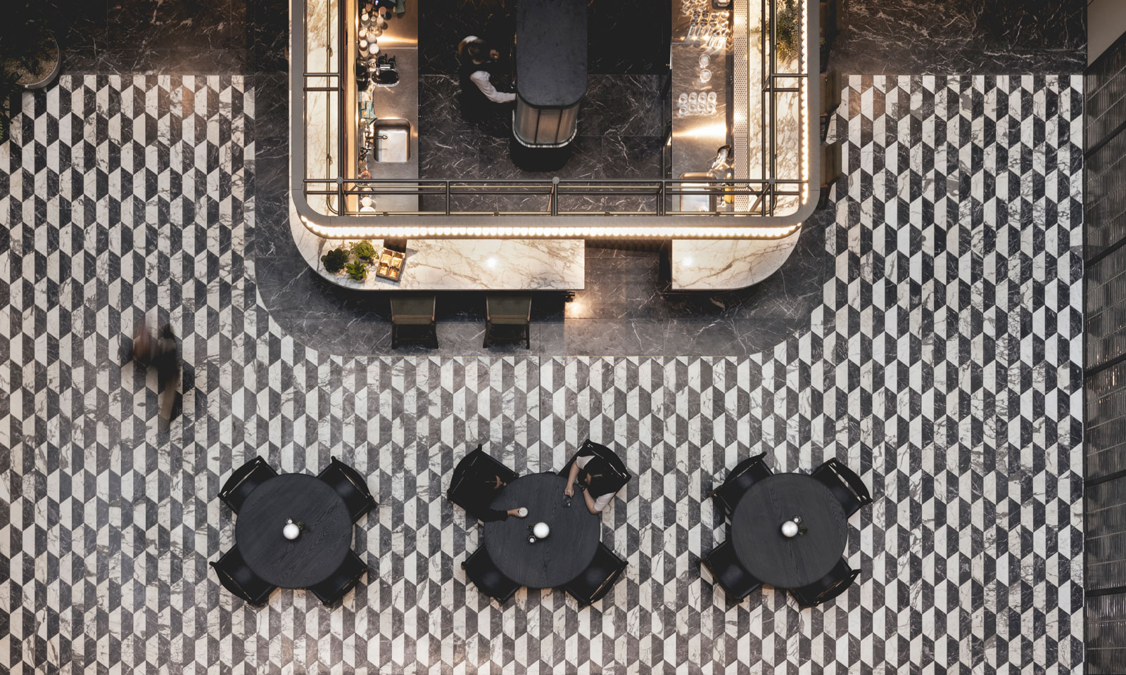 The bar forms an elegant focal point and source for refreshments for guests to perch on the high stools or retreat to the velvet banquets for informal meetings. MoreySmith ensures no detail is overlooked, and is designing the staff uniforms for the mainly monochrome space.