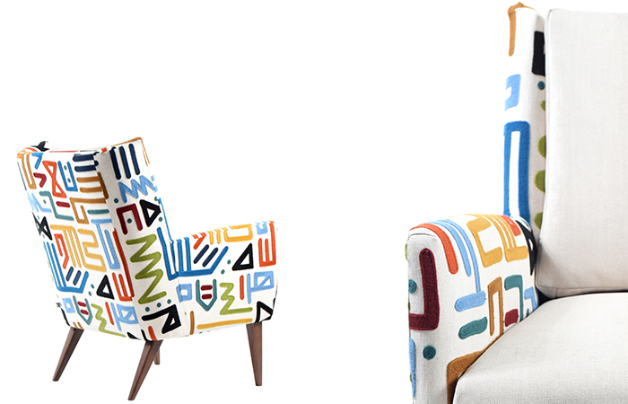 A pattern reminiscent of the 1980’s Memphis Group’s abstract geometry and Keith Haring’s pop stylings gives these Goodwood lounge chairs punch. Here the collection piece uses upholstery to showcase the graphic motif from fabric designer GP & J Baker.