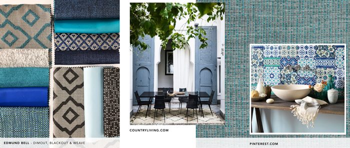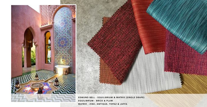 Dynamic colours inspired by ornate pattern usually dominate, but the cool colours of the ocean can also feature strongly. Tiles of course play a huge part in Moroccan design and the pattern element is truly inspirational! The plain colours from MATRIX and EQUILIBRIUM can capture that ocean inspiration.