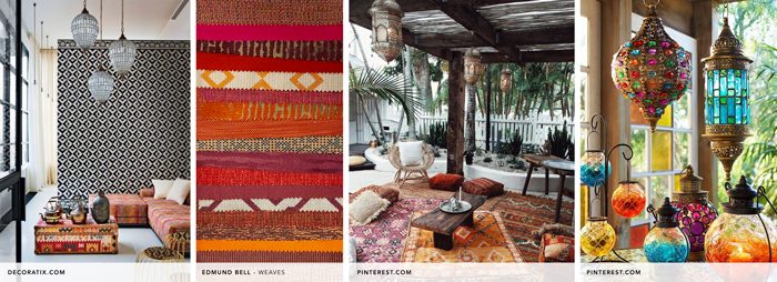 Reds, orange and pink contrasting with the black white elements of pattern, make for an impactful Moroccan space – blend with the rich patterned rugs and tin lantern accessories to bring the Kasbah vibe inside…..or outside of course! Typically, large floor cushions and low-slung day beds enhance that lazy day feel and by adding textured plant pots and gold accessories, it’s easy to see how inspiring this trend has become. Rich textiles and fabrics can be found in every corner of the markets with history inspiring all details of pattern and yarns used.