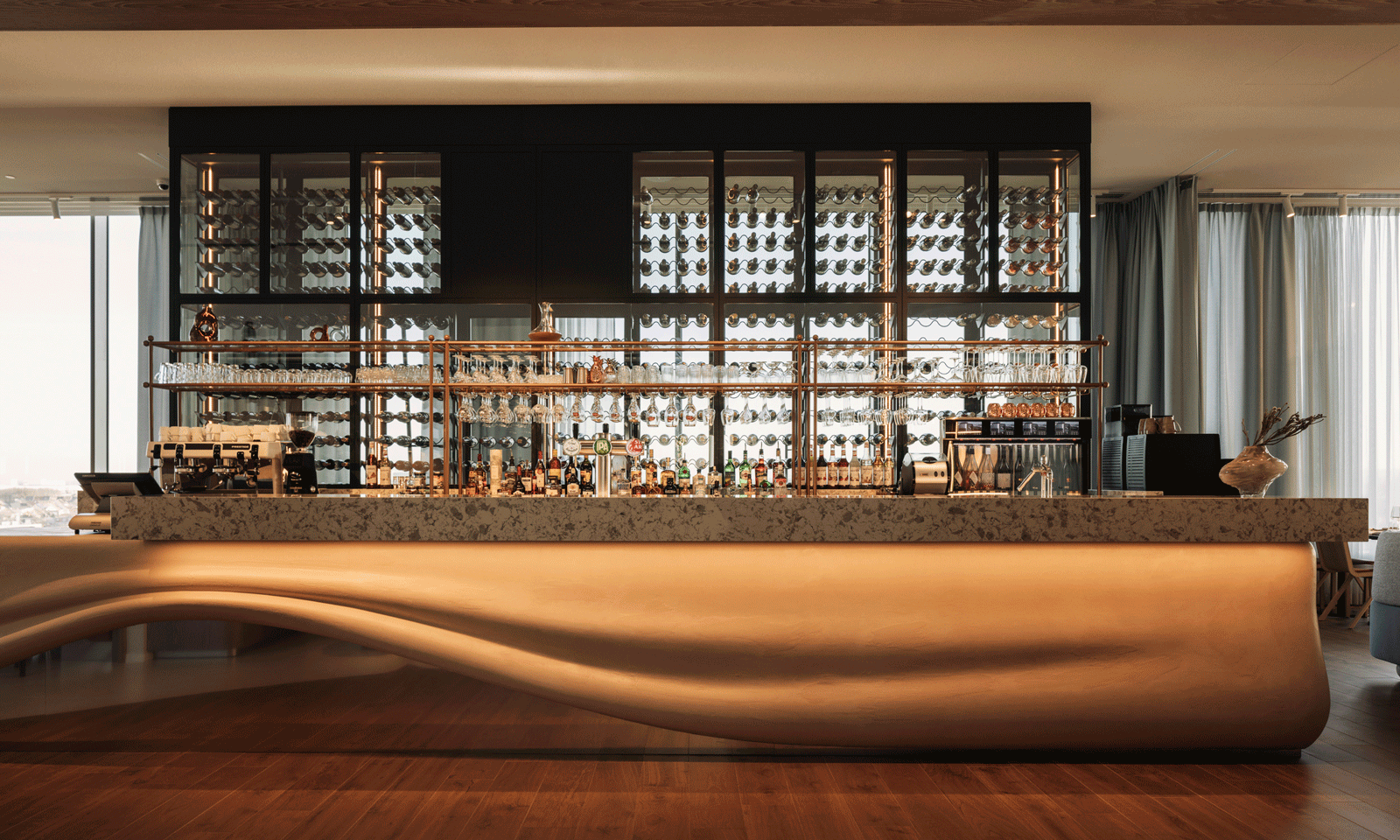 In the hotel restaurant, Magritte, a copper veil seems to float through the space, as if carried away by a gentle wind – emphasising the area its elevated position and the views out into the sky beyond.