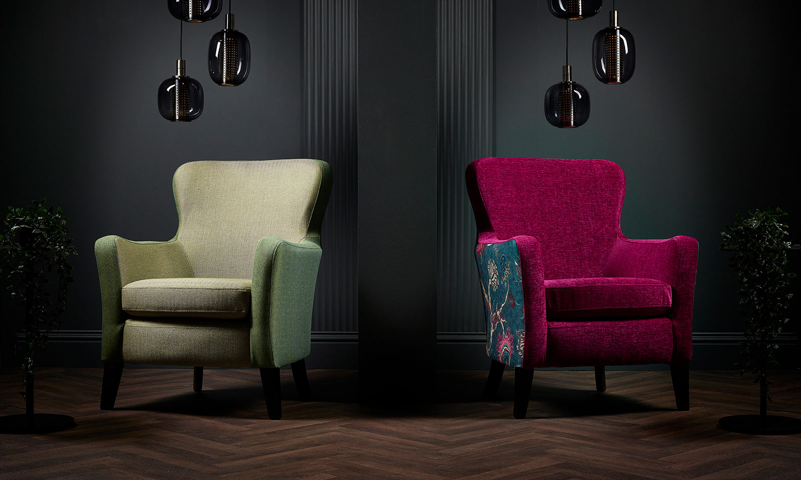 Images show Marmotte Magenta and Slalom Olive/ Orelle Elm, provided by Barons Furniture.