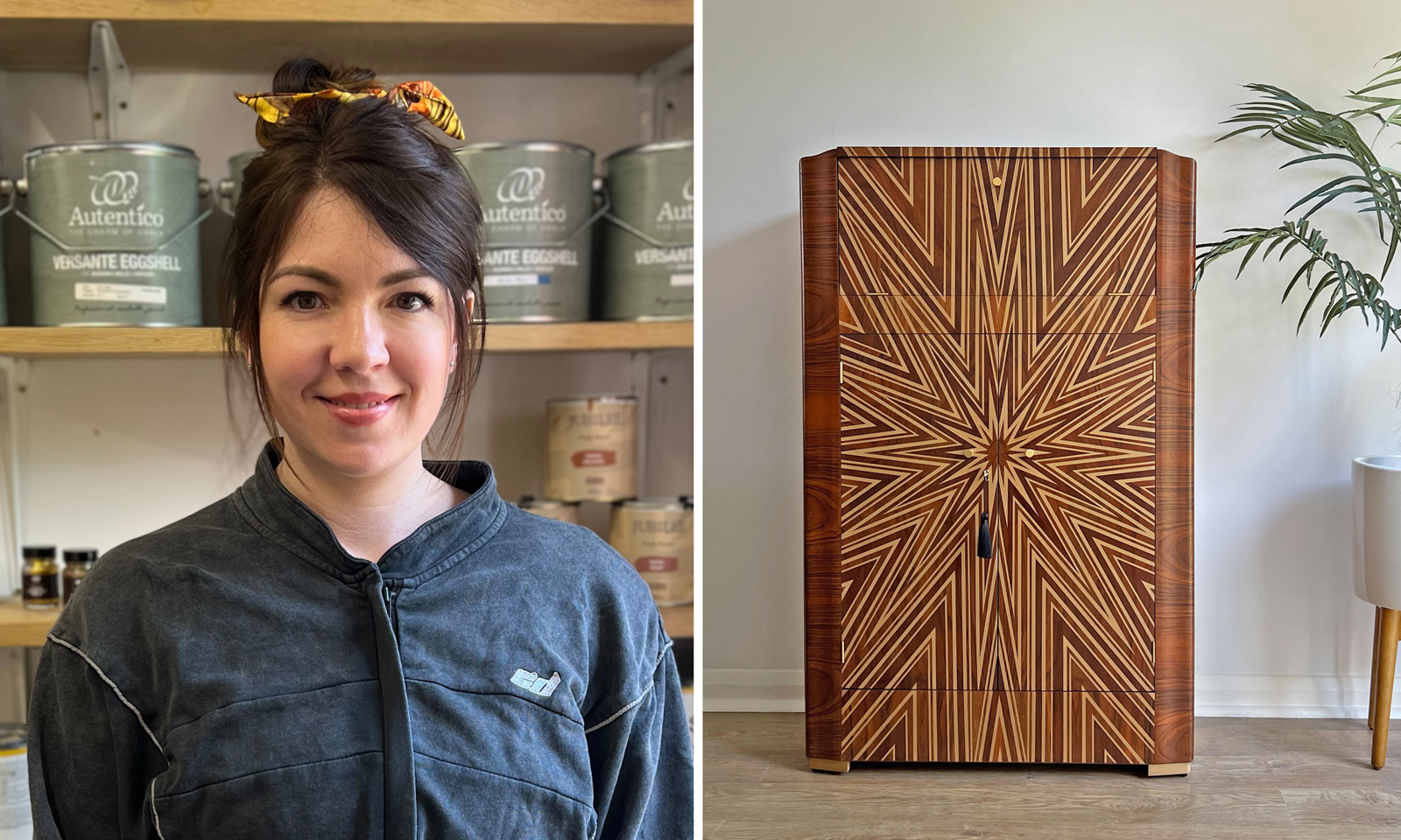 “I was thrilled to see my Starburst artwork being used in a different medium and in such a unique way. My Starburst was the first artwork I created whilst working on my first custom range when I started at Newmor straight out of university. I had the same excitement seeing the cabinet on social media as when I realised that it had got picked for our range 6 years ago! The inspiration behind my Starburst was from the Roaring 20’s, and I love that it’s been recreated and used on a drinks cabinet as that is what I imagined where it would be displayed! I had seen these Starburst’s from that era and from my favourite movie ‘The Great Gatsby’. I had used an existing texture from our archives to create the Starburst and it works perfectly with the Walnut! Kayleigh has created a truly beautiful piece.”