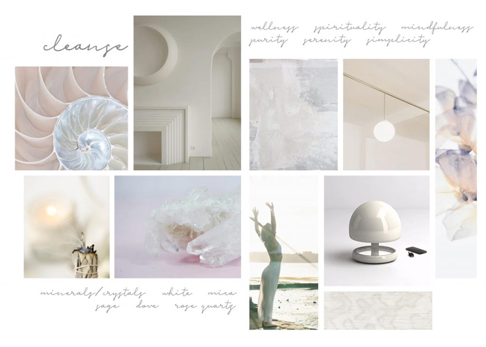 Cleanse is all about clean colours and simple serenity. Wellness and spirituality, including the practices of meditation and yoga, have increased in popularity.