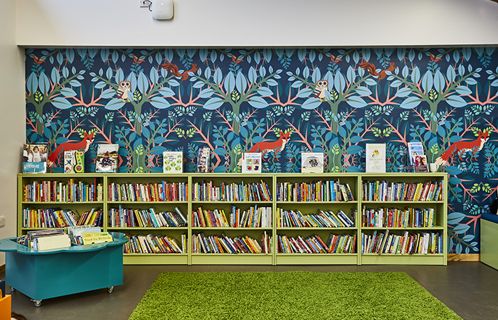Design Concept are specialists in the field of library design and they like to give every space something unique and uplifting. We were asked to incorporate illustrations of six woodland creatures into the large leafy pattern.