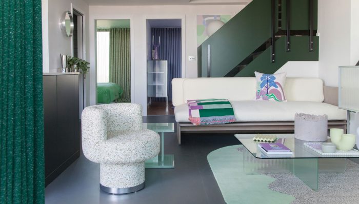 The 2LG Studio apartment combines Brutalism with contemporary design through a material, texture and colour palette that includes concrete alongside aluminium, jesmonite and fluted glass. 2LG Studio brings a strong edge to the urban aesthetic with its approach to lighting and furniture design, and consciously softens this experience with layers of deeply textured natural fabrics. The apartment features an exclusive new version of the design studio’s Capsule light and Stanley table, along with a bespoke series of rugs from its latest collection. As print is central to the studio’s approach, it has created a new series of wallpapers, soft furnishings and photographic artwork inspired by the Grade II*-listed building, which form a collection available to buy. The studio has also collaborated with a number of exciting new and emerging designers on bespoke pieces.