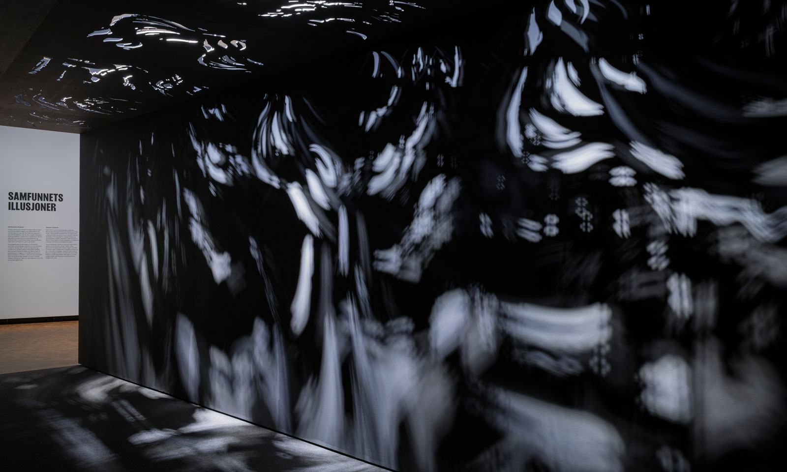 After the introduction, visitors arrive at the first transition area, which features a light and sound installation. Its ceiling is created from a stepped, laser-cut pattern (using Valcromat), taken from a detail of a Munch painting, with backlighting creating a 360-degree immersive reflective space washing over the walls and black carpet. Sound artist Carolyn Downing, who is very experienced in conjuring atmospheres from her work in the theatre, created a series of abstract sounds for this space to ensure an emotional response from visitors. The sound design is partly made up of rhythm and partly of texture, separated into four sounds that pan across the space, sensitising visitors to the environment awaiting them.