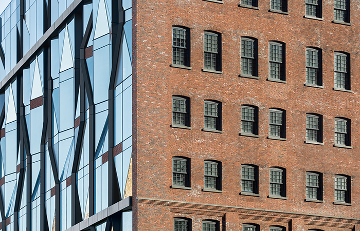 A delicate balance of glass, steel, brick, and spandrels give the building a modern sensibility without compromising its industrial heritage, while the reflective facade engages people far and wide, making it a new landmark along the water’s edge.