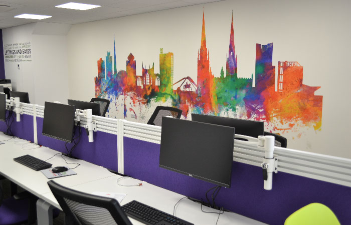 The installation of suspended ceilings, lighting, air handling, wall linings and flooring were enhanced by feature walls and the creative use of furniture from Lee & Plumpton. The addition of walnut slatted screens allowed separation of the spaces whilst still maintaining the overall design concept. The finished office features a high impact, colourful mural depicting the Coventry skyline as the centre piece for the project.