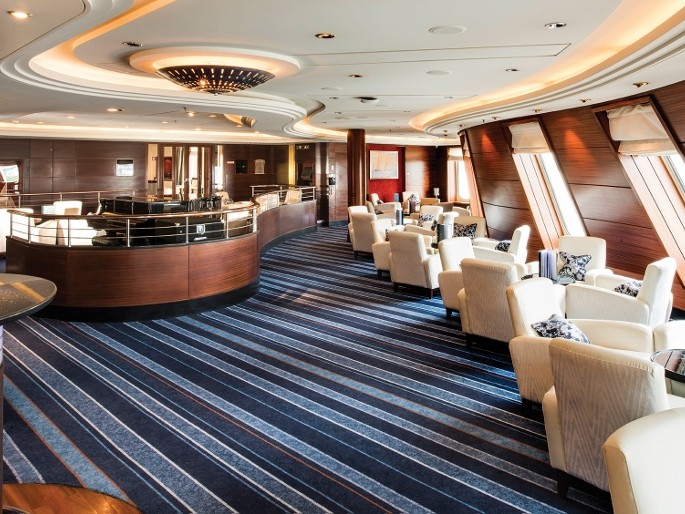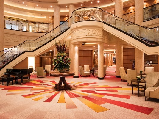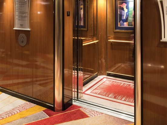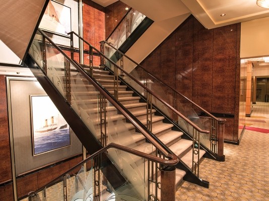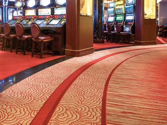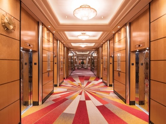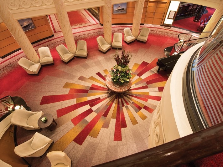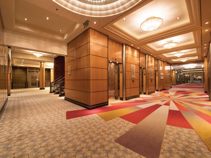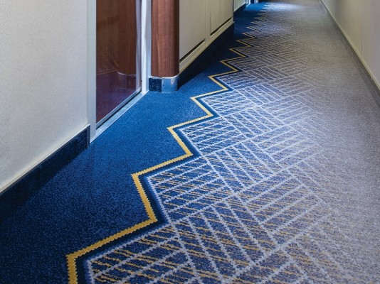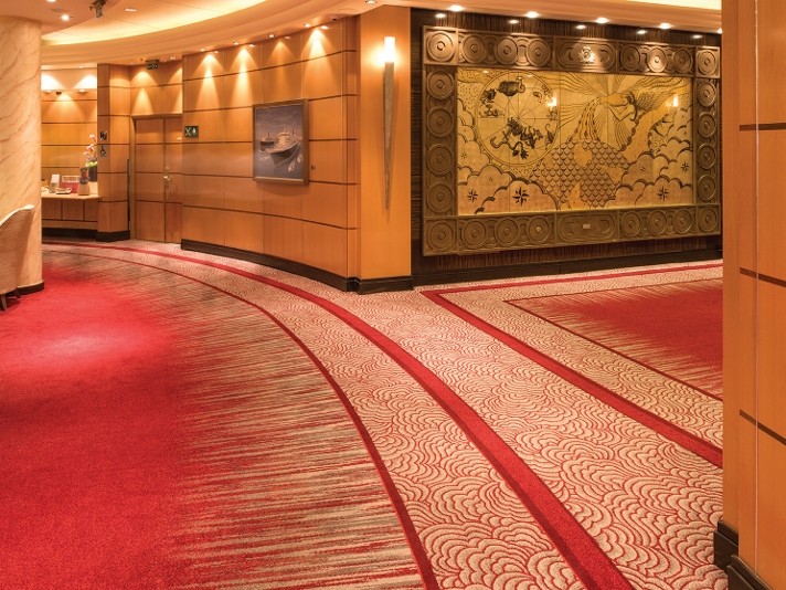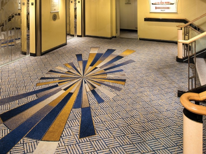 Although the ships interiors are inspired by the history and regal heritage of the ship, the ‘Ulster’ carpets bring an element of modernism while fitting in perfectly with the traditional aspects. The colours were carefully selected to complement the striking designs, with royal reds, golds and deep sea blues flowing under your feet. The most fabulous carpeting feature is without a doubt the retro style ‘starburst’ carpet in the main atrium, which is undoubtedly the show piece of the ship.