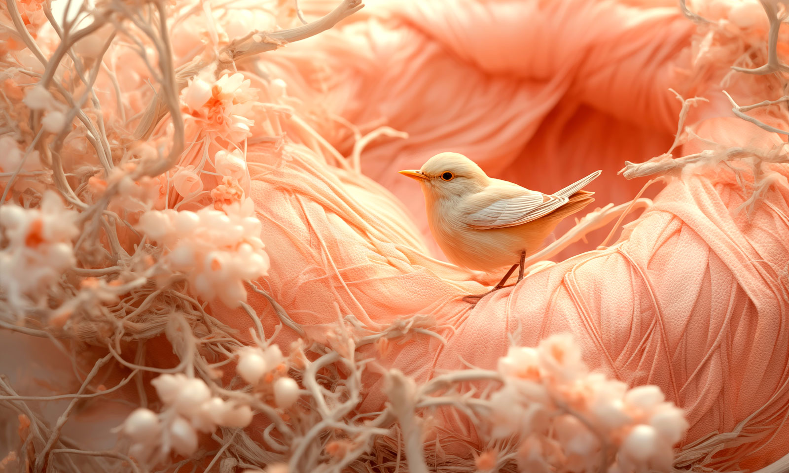 For the Pantone Color of the Year 2024 PANTONE 13-1023 Peach Fuzz, Ultrafabrics engaged Belgium-based WeWantMore Studio to design and develop visual concepts that show the warm, tactile peach color in all its glory. Nestled between pink and orange, PANTONE 13-1023 Peach Fuzz is a velvety gentle peach whose all-embracing spirit enriches mind, body and soul. Using AI as a tool, WeWantMore created this powerful image of a dainty bird perched in its home – a nest made out of Ultrafabrics – surrounded by a dreamscape of flowers. It embodies the very essence of PANTONE 13-1023 Peach Fuzz, which brings tactility, comfort, and warmth.