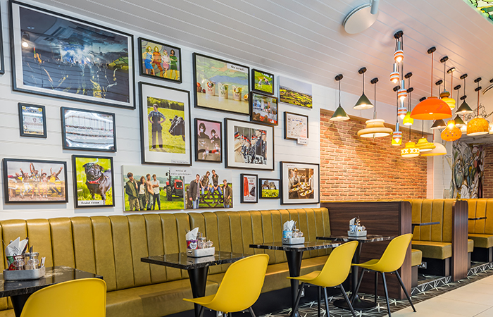 The interior features a dual ‘warm and cool’ concept, with a white and bright ‘cool’ area to the right for grab’n’go produce and the mini retail area, underlining the freshness of the dairy produce range, and a warmer ‘natural’ sit-down area to the left, underlining the brand’s countryside origins and authenticity.