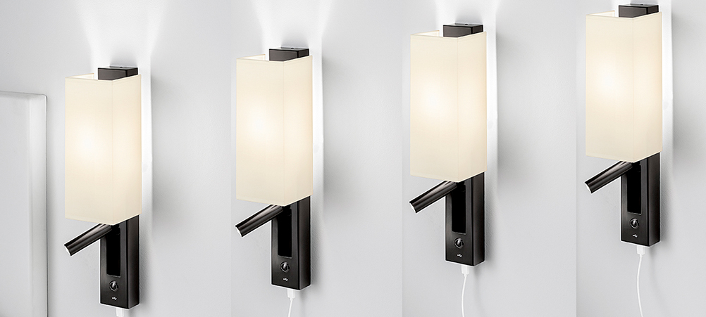 LED Dock Combination by Chelsom is a slender hotel guest room or ship cabin wall light ideal for the bedside with main room illumination from within the fabric shade.