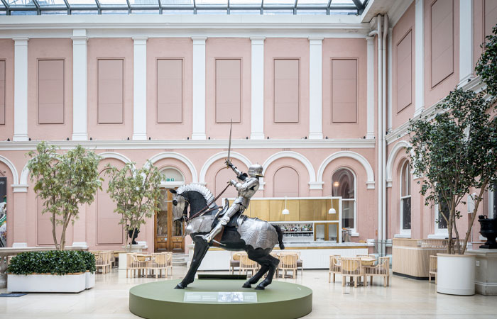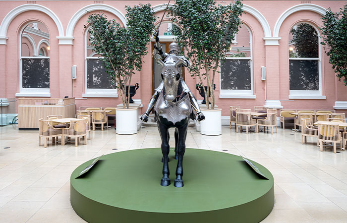 Until the nineteenth century, the fifteenth-century equestrian armour was preserved in the ancestral home of the Freyberg family at Schloss Hohenaschau in Bavaria. Around 1850 the contents of this formidable mountain fortress were sold at auction, and the armour was acquired in 1867 by the Comte de Nieuwerkerke, who displayed it in his apartment at the Louvre in Paris. In 1871 the armour was sold to Sir Richard Wallace, along with the rest of the Nieuwerkerke collection. Now, for the first time in over 100 years, the armour will be redisplayed for a limited time at the centre of the building’s courtyard café, beneath the glass-roofed central atrium. The new display sees the knight-and-horse armour set on a bespoke green circular plinth, complementing the greenery of the courtyard area, with information graphics highlighting key moments in its history including a photograph of its former home in the Louvre, and new graphics on the windows to set the scene of encountering the armour within a wood or forest.