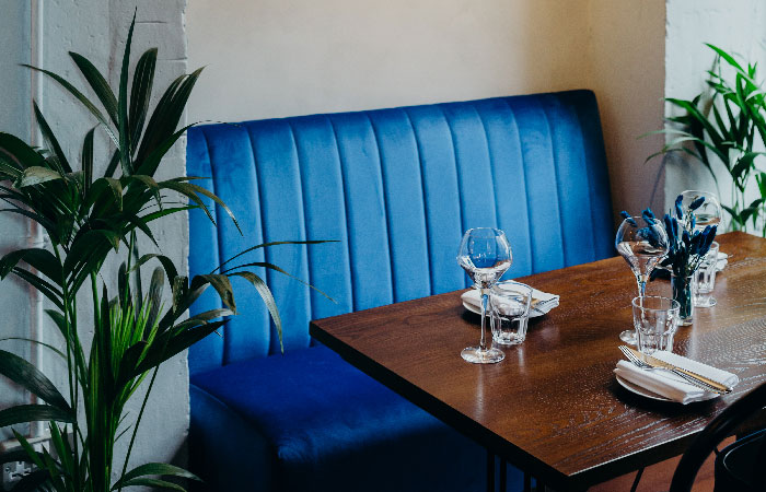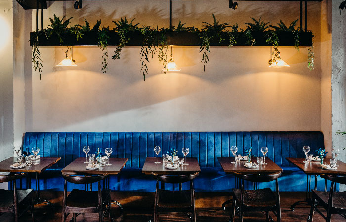 The client wanted to also cater to parties of all sizes, so the design featured a six-metre-long banquette seating on one side of the space with a scalloped detail covered in Prestigious Textiles’ Velour Indigo fabric. The banquette seating was custom made by John Drummond Furniture in Cork. This gave the client the flexibility to have various sized parties and it became one of the main focal points of the restaurant.