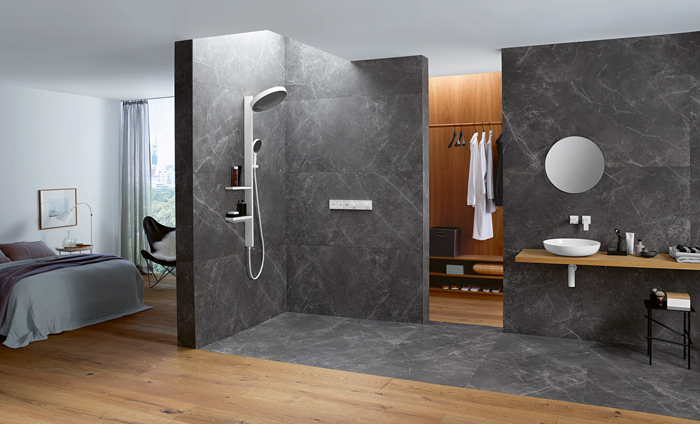 The bathroom is increasingly the place to unwind and relax. With functional, clinical aesthetics being replace by spaces that enhance wellbeing, bathroom design is having to adapt to meet the demand. Due to its large circular showerhead and adaptable wall connection, Rainfinity offers the flexibility to envelop the entire body in soft cocooning water. The innovative wall connection allows the shower head to be tilted between ten and thirty degrees, eliminating the need for a conventional shower arm, making for a more comfortable showering experience and enabling the user to keep the head and face dry if required. The shower experience is further enhanced by Rainfinity’s slightly concave surface and its diffused arrangement of jet disc holes. This combination ensures spray isn’t limited to the head and shoulders but softly showers the entire body with aerated droplets.