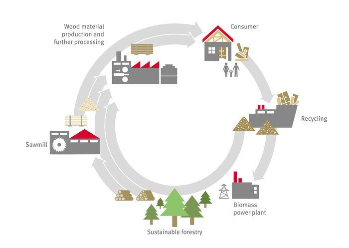We use round wood, sawmill co-products, and recycled wood to produce our wood-based products, and are committed to developing new ways of reclaiming and recycling the materials used in production.