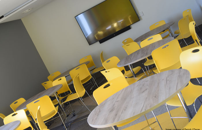 Over 650 high-density stacking Maestro chairs were selected in Ultra Blue, Zesty Lime, Nemo (orange), Rubber Ducky (yellow), Flannel (dark grey) and Mardi Gras (purple). Many of these were upholstered with seat pads in Camira fabrics to provide additional comfort. Several transport dollies were also provided to allow these chairs to be stacked and moved around quickly and easily, adapting to student needs. A further 65 stacking Plaza chairs were selected in Apple Green and Flannel to complement large, collaborative tables.