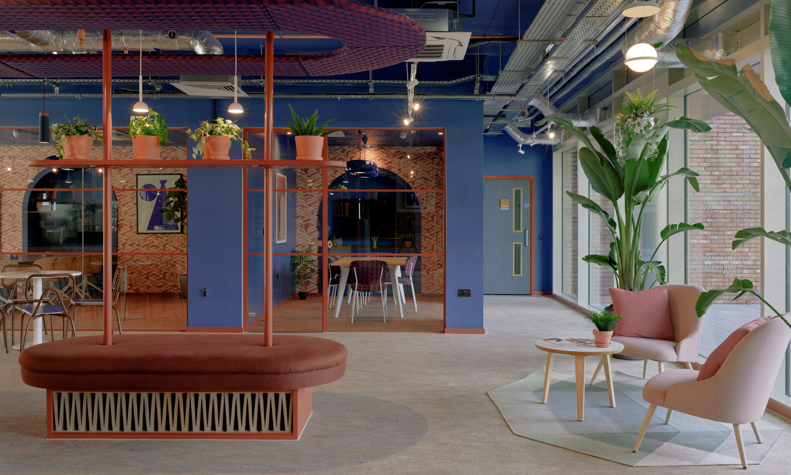 The teapoint is lit by four Blush Pendant Lights in white from Northern. Opposite are two sets of 4-person table seating arrangements and then, behind these, a long, glazed wall announcing the large co-working and the smaller quiet study spaces. These include chairs in complimentary colours and a variety of worktops and booths, with a large central table the main focus point of the co-working area. This bespoke blue table with a triple edge with a central inset layer is in the shape of the arch motif, playfully inset into a wall arch, as if it has just been leveraged out. The booth areas feature a fabric backing from Textile Mania, whilst the acoustic ceiling grid in the space has been painted blue and arranged at angles in an on-theme geometric styling. Two feature pendant lamps in blue by Tom Rossau are made of bent ply. A graphic wallpaper by Rebel Walls incorporates a ‘city wall’ pattern in shades of terracotta and, once again, offers a playful sense of depth. Pendant lights in the booth in a deep terracotta colour are Flowerpot VPI Pendant Lights from &Tradition. The co-working space also includes a large-scale potted plant / small tree and artworks featuring simple shapes that suggest pottery vessels.