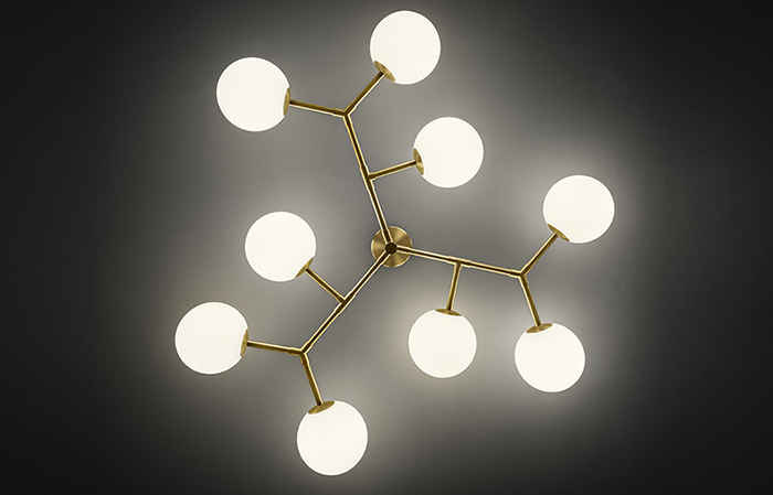 Constellation is an organic design giving a random pattern of arms and Matt Opal glass globes creating a striking selection of statement centrepiece ceiling fittings emitting warm white light for an ambient effect. Glasses have threaded inserts which screw on to Brushed Brass metal frames for a durable fixing ensuring perfect alignment. Custom designs and sizes can be manufactured on request.