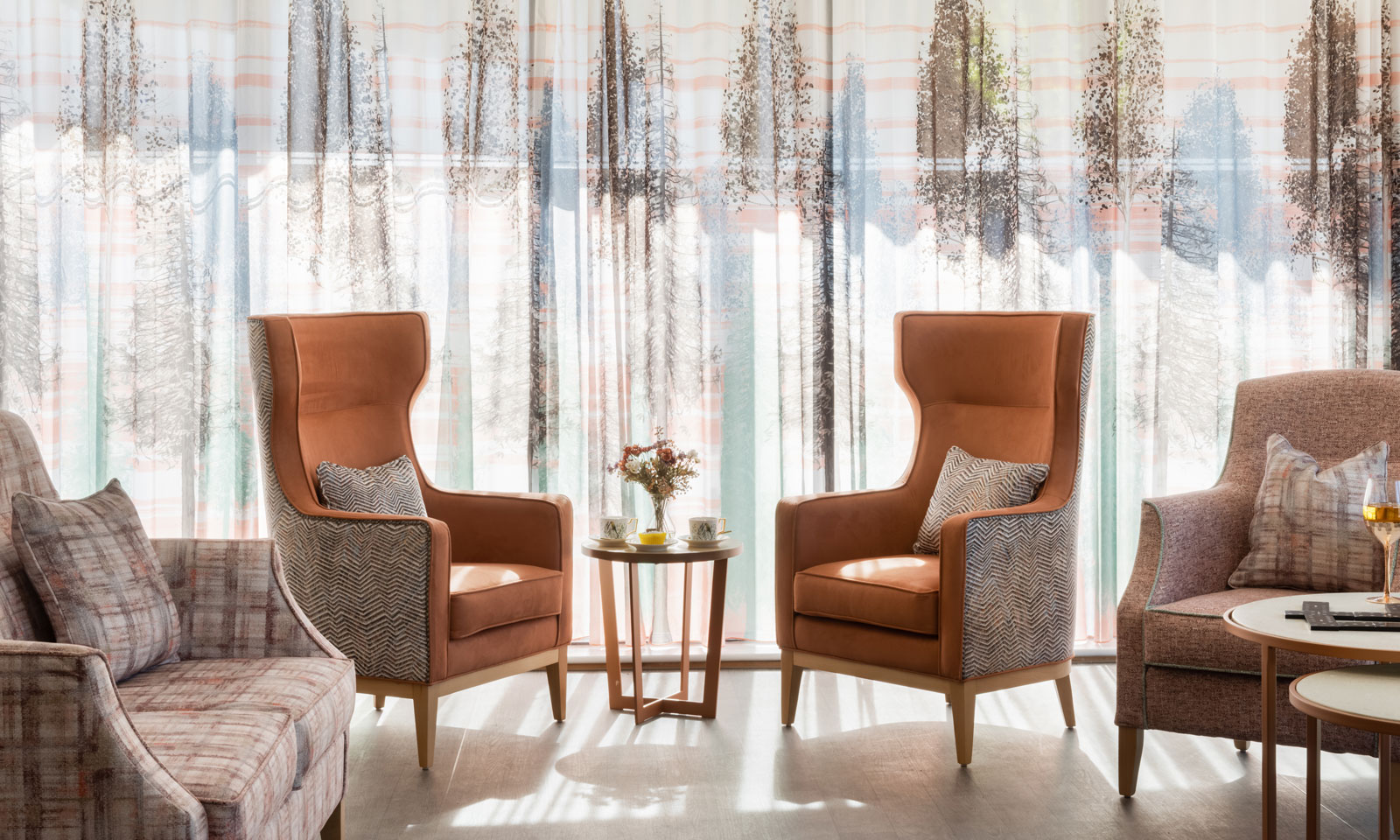 The design connects with the local area using local history, geography and attractions for inspiration. The ground floor lounge features a pair of Valls Wing Back Chairs with the Elba Side Table with a copper base to complement the fabric on the chairs. The Mijas chair and sofa provides additional seating alongside the Isola Nesting Tables, which can be easily moved for residents to use. The nature inspired design was based on the region’s iconic Mulberry bushes and brings a sense of calm and serenity to the lounge.
