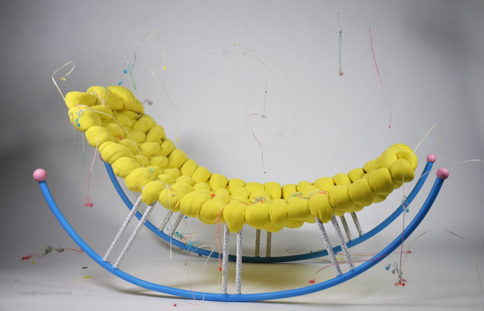 Grace Charlotte Mills: Playing shouldn’t be just for children. With employment and financial stresses creating an anxious environment for Millennials, BRUCE allows users to escape and become child-like again. The motion that rocking offers forms the popular body play and movement. Combining this with the use of bright and bold colours and the oversized and vibrant weave, creates the perfect escapism from real life for Millennials.